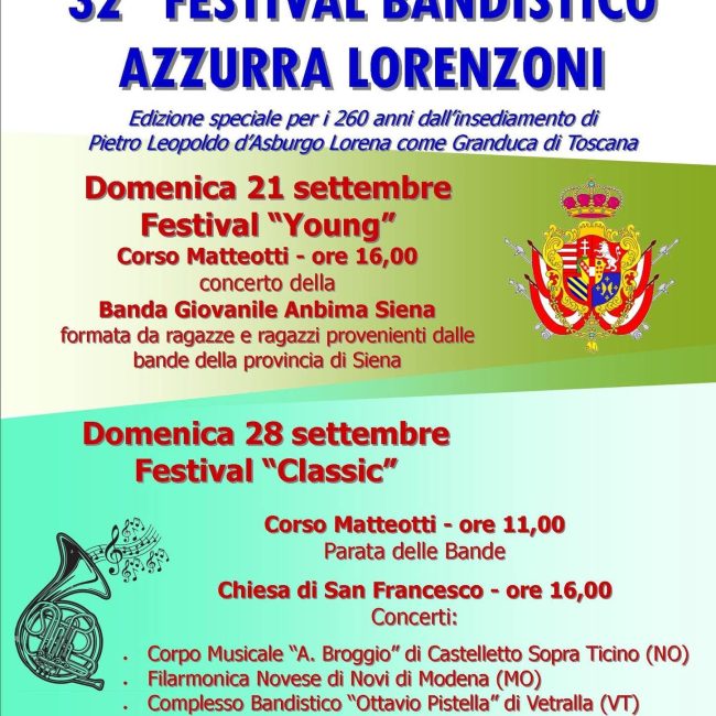 Torna uno degli appuntamenti musicali più attesi dell'anno! Due domeniche all'insegna della musica bandistica, della tradizione e della condivisione, nel cuore della città. Domenica 21 settembre - Festival "Young" ore 16:00 - Corso Matteotti Concerto della Banda Giovanile ANBIMA Siena, composta da ragazze e ragazzi provenienti dalle bande musicali della provincia di Siena. Un pomeriggio dedicato ai giovani talenti e al futuro della musica bandistica! Domenica 28 settembre - Festival "Classic" ore 11:00 - Corso Matteotti Grande Parata delle Bande per le vie del centro storico ore 16:00 - Chiesa di San Francesco Concerti delle formazioni ospiti: