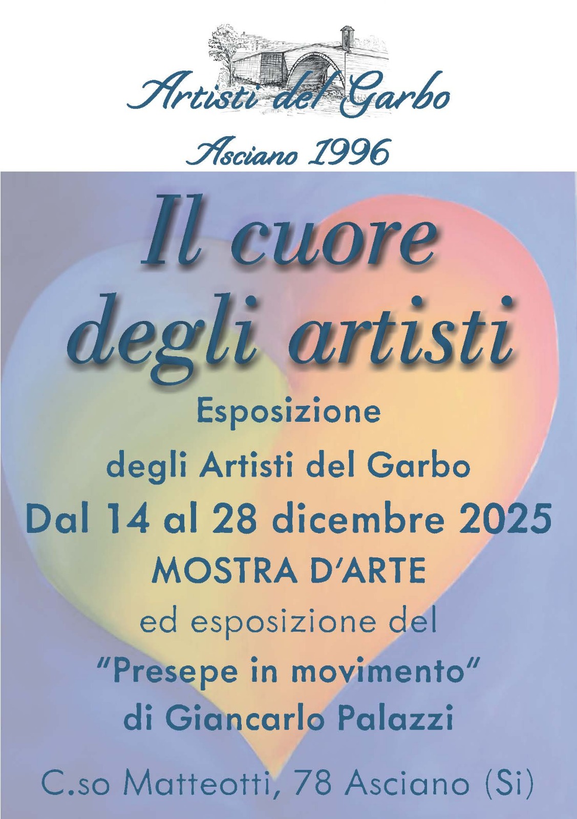 Dal 14 al 28 dicembre, Corso Matteotti 73, Asciano Mostra d’Arte “Il Cuore degli Artisti” a cura dell’Associazione “Artisti del Garbo” e Presepe in movimento di G. Palazzi (dal 7 dicembre)