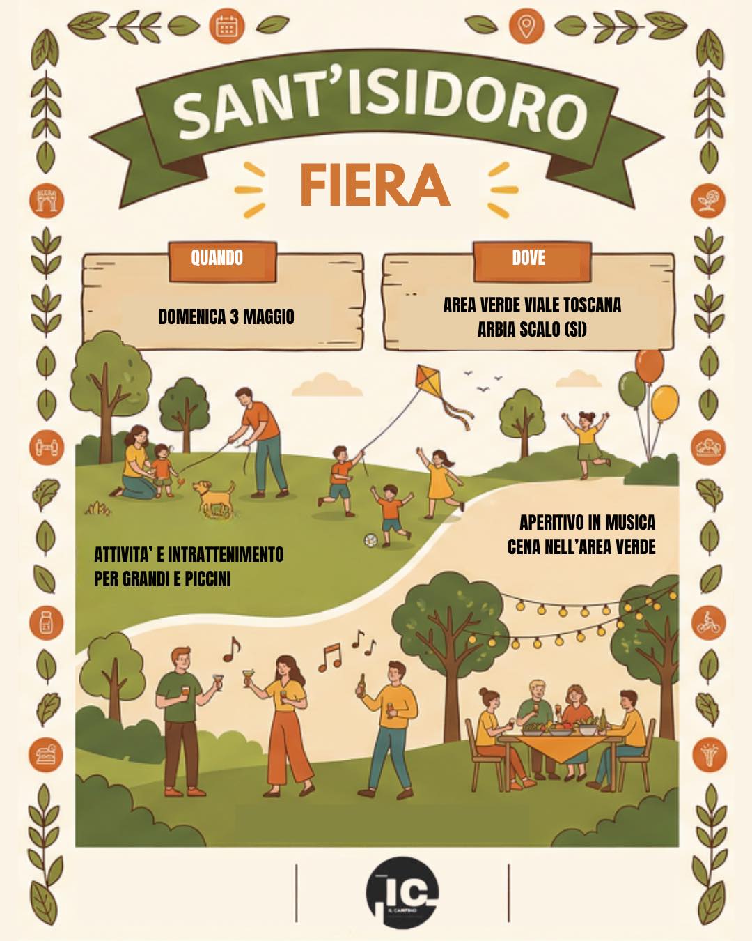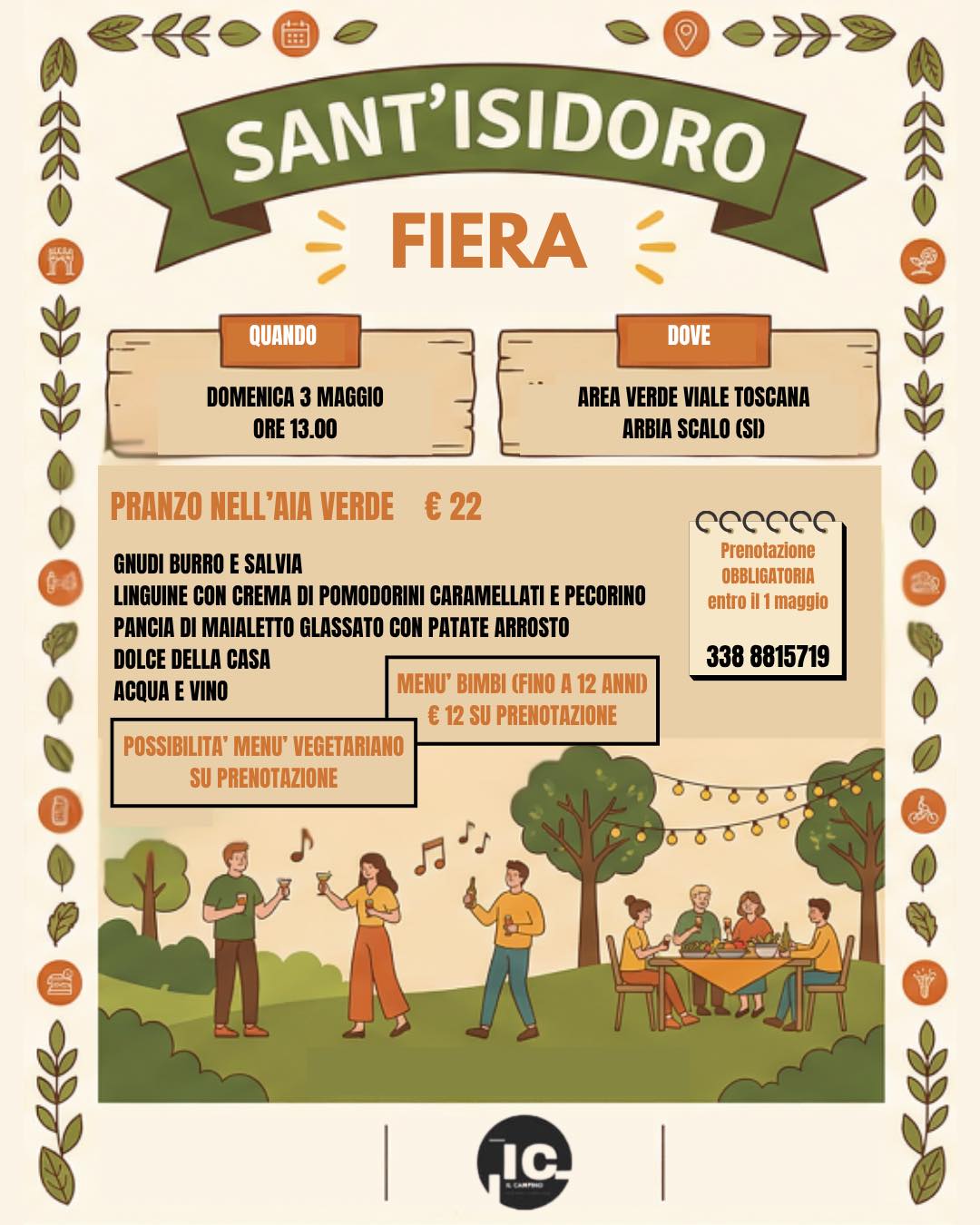 Torna la Fiera di Sant’Isidoro!Non c’è niente di meglio di una domenica in compagnia, all’aria aperta e con il buon cibo della nostra tradizione.In occasione della Fiera di Sant’Isidoro, il Siena Riding Club aspetta tutti i bambini per un pomeriggio all’insegna del divertimento e della scoperta.Attività ludica ed educativa gratuita per tutti i bambini!Possibilità Esperienza Slow nelle Crete Senesi: Una passeggiata di un’ora a cavallo per i più grandi (dai 14 anni in su).La prenotazione è obbligatoria entro il 2 maggio al 338 3202408 (Letizia).Vi aspettiamo per festeggiare insieme tra musica, risate e un menù che vi farà leccare i baffi!Il nostro Menù (€ 22,00):• Gnudi burro e salvia• Linguine con crema di pomodorini caramellati e pecorino• Pancia di maialetto glassato con patate arrosto• Dolce della casa, acqua e vino inclusi!Menù Bimbi (fino a 12 anni): € 12,00 su prenotazione.Opzione Vegetariana disponibile su richiesta!Prenotazione per il pranzo obbligatoria entro il 1 Maggio al: 338 8815719Dove: Area Verde Viale Toscana, Arbia Scalo (Siena).Non mancate, portate la voglia di stare insieme!