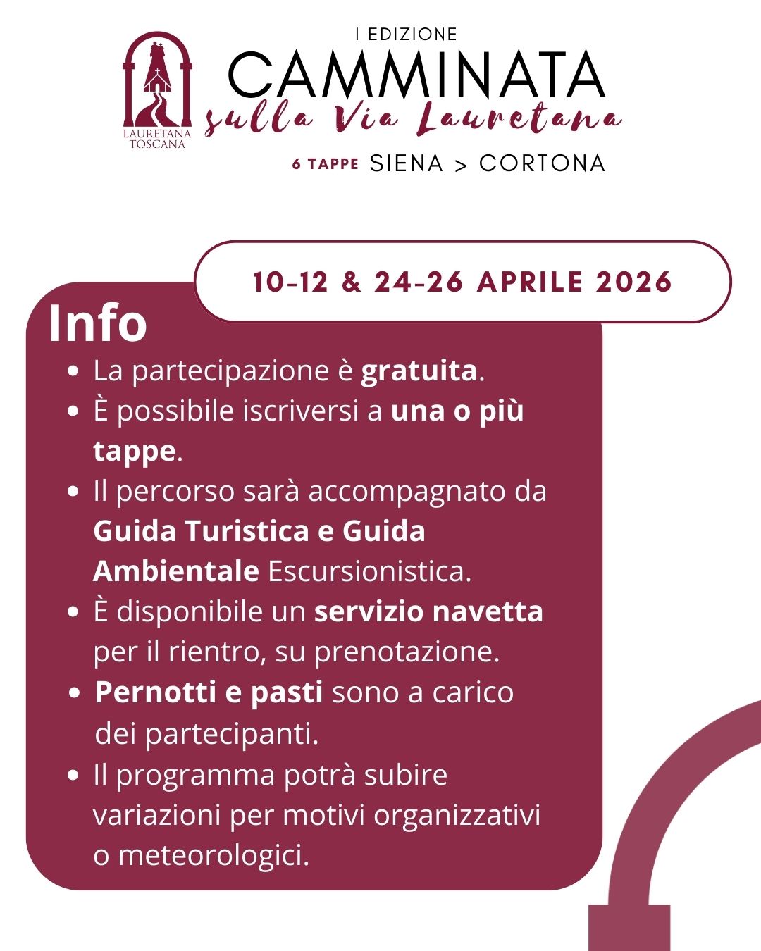 La DMO Lauretana ETS promuove la prima edizione della Camminata sulla Via Lauretana, un evento articolato in due fine settimana (10-11-12 e 24-25-26 aprile), lungo il tracciato storico da Siena a Cortona.